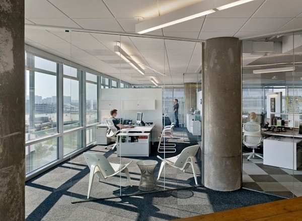 Довольно светлый, просторный и дающий ощущение расширения пространства офис разместился на 4.300 квадратных метрах. Как вы уже, наверное, заметили, основным источником освещения является естественный свет. Для сотрудников, которые постоянно встречаются с клиентами, руководство решило спроектировать 'длинные и широкие коридоры, которые не будут делиться рабочими местами и комнатами'. Использование контрастных цветов в таких проходах направлено на повышение энергетического заряда работников.