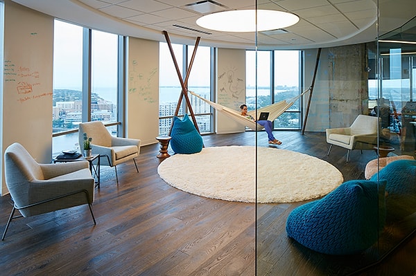 Компания 22squared хотела отразить город Тампа в своем офисе в полной мере. Таким образом, на этапе проектирования они использовали магазины, производителей, поставщиков услуг и товаров только из города Тампа, уделяя особое внимание тому, чтобы все они были именно местного происхождения! В результате получился офис, куда работники идут с огромным энтузиазмом.