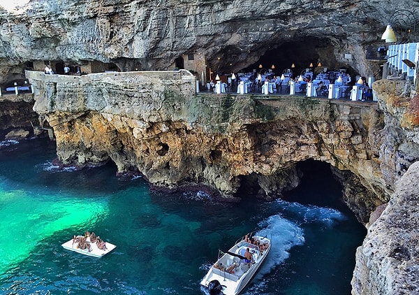 Разве может быть что-нибудь романтичнее, чем ужин при свечах на берегу моря? Может! Ужин при свечах на берегу моря в итальянском ресторане, расположившимся в гроте пещеры. Ресторан отеля “Grotta Palazzese” находится в известняковой пещере, в городе Полиньяно-а-Маре, в Южной Италии. Вы не только обедаете или ужинаете в пещере, (что уже само по себе необычно) но и наслаждаетесь прекрасным видом на Адриатическое море и отвесные утесы.