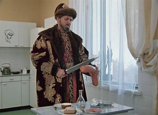 В кадре Иван Грозный жарит котлету. На вопрос 'Где живёте?' он отвечает: 'В палатах' (начальный вариант 'Москва. Кремль'). На вопрос Бунши 'За чей счёт банкет?' поступает ответ: 'Ну, во всяком случае, не мы' (оригинал звучал: 'Народ, батюшка, народ').
