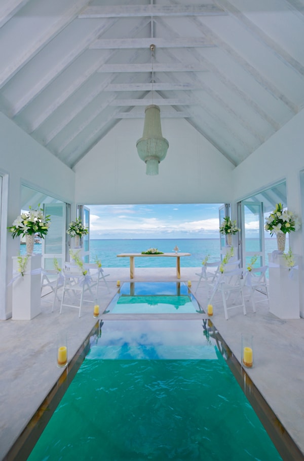 «Часовня» с полом из прозрачного стекла вмешает в себя около 16 гостей и имеет внутри все необходимое для проведения церемонии. Павильон посреди океана является не только местом проведения свадеб, но и центром реабилитации для раненых черепах. В стеклянный пол «часовни» встроен наполненный водой вольер с черепахами. Так что молодожены и гости свадьбы могут увидеть результат тяжелой работы по спасению черепах, просто посмотрев себе под ноги. Такая свадьба, безусловно, надолго останется в памяти.