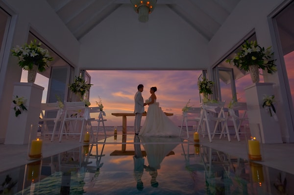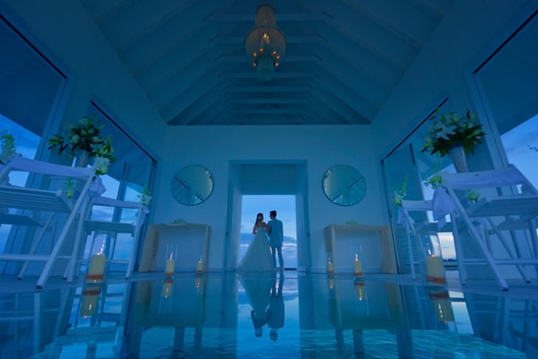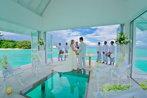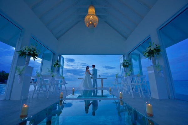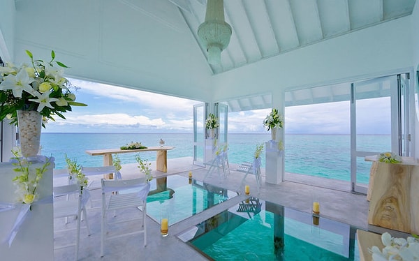 Курорт “Four Seasons Resort Maldives at Landaa Giraavaru”, что находится на одном из Мальдивских остров, предоставляет необычную услугу для тех, кто решил скрепить свои отношения узами брака. Теперь молодые люди могут произнести клятву верности и любви, стоя посреди бескрайних голубых просторов Индийского океана.