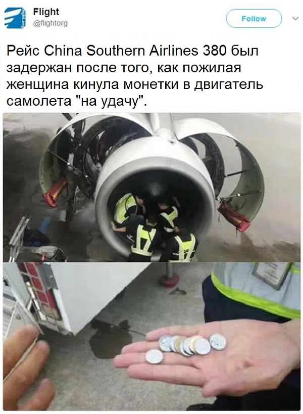 Внутренний рейс из Шанхая в Гуанчжоу (КНР) задержали из-за старушки, которая бросила несколько монет в двигатель самолета. Техникам пришлось вскрыть мотор, полностью проверить его и вычистить.