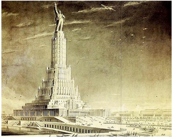 Тендер на проект Дворца Советов был объявлен в 1931 году и состоял из нескольких этапов. Дворец Советов задумывался как самое большое здание на Земле. На высоте 415 метров он затмил бы два самых высоких здания того времени: Эйфелеву башню и Эмпайр-стейт-билдинг. Но опять же, его так и не построили.