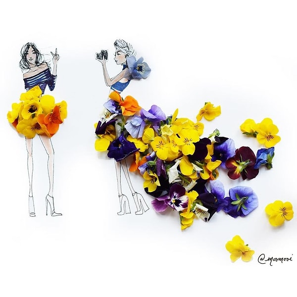 Moomooi, дизайнер, работающий с такими известными брендами, как Coach, Grey Goose, Patron, CosmoGirl, Pantone, Soho House и Tory Burch, использует для своих модных эскизов удивительно творческие и неповторимые методы рисования! Ее работы, сделанные из цветов и овощей, поразят своей легкостью, воздушностью и неординарным подходом к созданию иллюстраций.