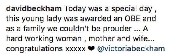'Сегодня был особенный день, эта юная леди была награждена орденом Британской империи, и нет слов, чтобы описать, как вся наша семья ею гордится... Трудолюбивая женщина, и вместе с тем прекрасная мама и жена... Поздравляем'