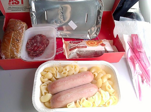 Авиакомпания 'Россия' кормит своих пассажиров макаронами с тефтелями, слойкой с абрикосовым джемом и булочкой с маслом.