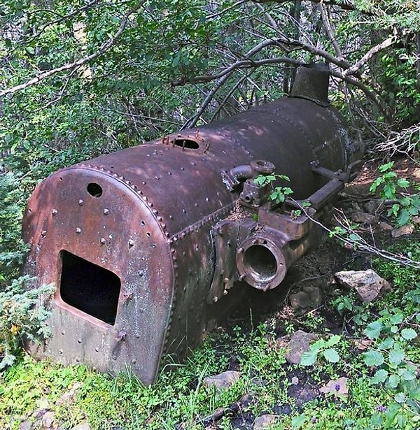 Это паровой котел. Возможно от двигателя поезда, или, более вероятно, из здания, используемого для отопления или производства энергии для добычи полезных ископаемых.