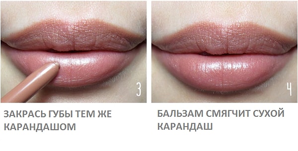 Обведи контур губ и закрась их карандашом, затем используй любимый блеск или помаду.