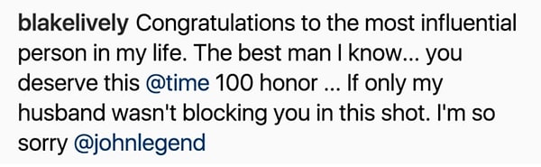 «Искренние поздравления самому важному человеку в моей жизни! Ты лучший мужчина из всех, кого я знаю... Ты заслужил эту награду. Вот если бы мой муж не заслонял тебя в этом кадре. Мне так жаль, Джон Ледженд!»