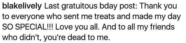 Последний дурацкий пост на мой день рождения: спасибо всем моим друзьям, которые прислали мне подарки и сделали этот день таким особенным! Я люблю вас. И все мои друзья, которые не прислали ничего: вы мертвы для меня».