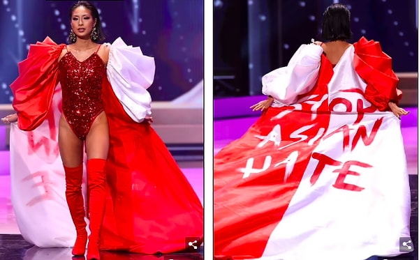 Мисс Сингапур Бернадетт Белль Онг решила включить яркое послание в свой костюм и решила осветить движение #StopAsianHate с помощью расшитого блестками боди с хэштегом на бело-красной накидке.