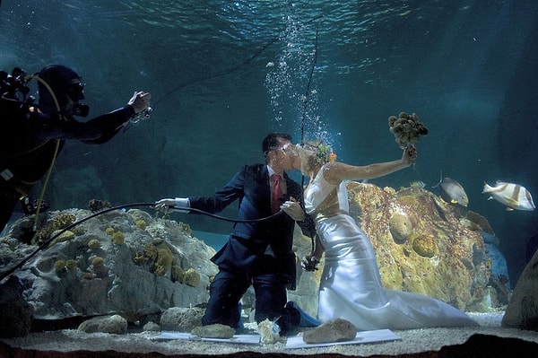 Если вы следите за веяниями моды, то наверняка знаете, что в этом году подводные свадьбы стали настоящим трендом. Если решитесь на такой необычный способ сочетаться священными узами брака, не забудьте позаботиться о том, чтобы подготовиться к погружению заранее – все-таки это не так-то просто. А банкет можно устроить прямо на берегу моря!