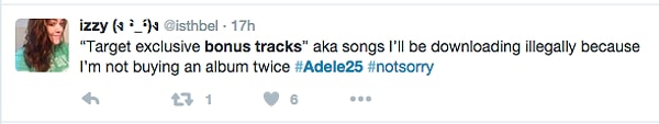 ««Эксклюзивные треки Адель от “Target”» . Да я скорее скачаю эти три песни нелегально, чем еще раз покупать альбом!!!»