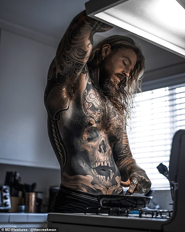 Он начал с татуировки черепа на животе, чтобы скрыть шрам от подтяжки живота, и с тех пор Кевин потратил 30 000 долларов и 250 часов под иглой, татуируя все свое тело.