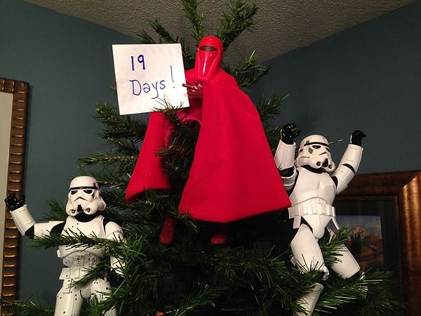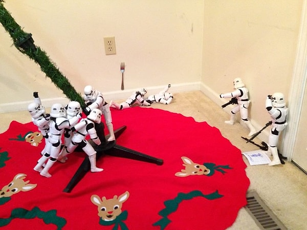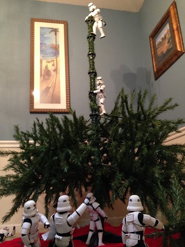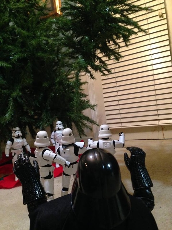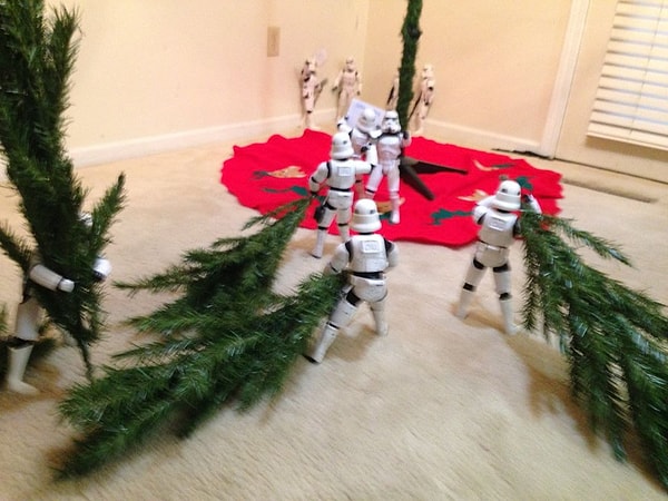 На серии фотографий, которые Кайли запостила в фейсбук, армия штурмовиков из «Звездных войн» дружно устанавливает искусственную елку.