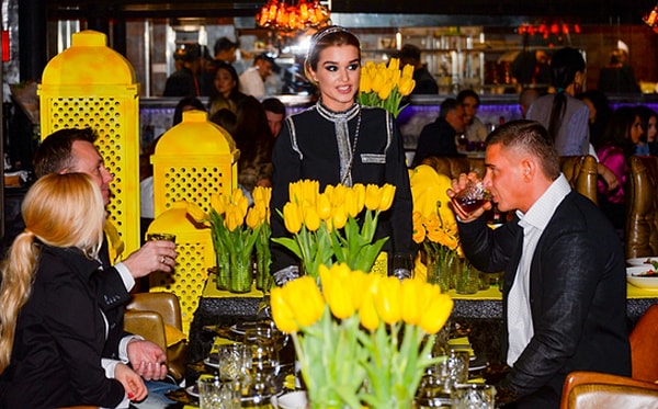 Банкетный зал украсили желтыми тюльпанами, на столе можно было найти алкоголь даже на самый притязательный вкус, а в довершение вечера был подан авторский шестиярусный торт, выполненный Ренатом Агзамовым.