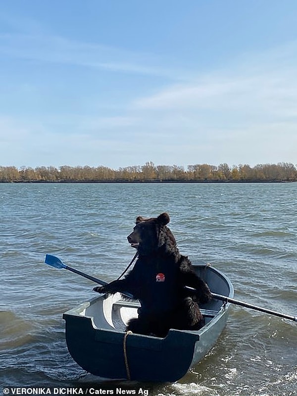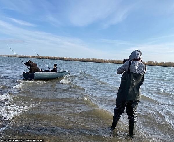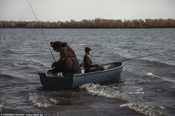 На этих фотографиях изображен очаровательный бурый медведь и его хозяйка, которые вместе ловят рыбу на лодке в России.