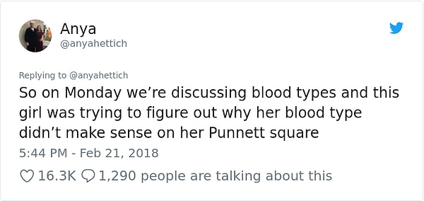 «В понедельник мы обсуждали группы крови, и эта девушка пыталась понять, почему ее группа крови не вписывается в решетку Пеннета».