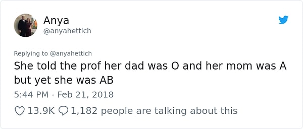 «Она сказала профессору, что ее отец обладал нулевой группой крови, а мать - группой крови 'А', но при этом группа крови самой девушки была 'АВ'».