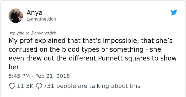 'Профессор объяснил, что это невозможно. Он сказал, что, может быть, она перепутала группы крови, и даже нарисовал разные решетки Паннета, чтобы показать девочке, почему этого не может быть'.