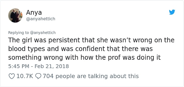Студентка из Калифорнийского государственного университета, изучавшая группы крови и перенос генетической информации, столкнулась с очень странной для нее ситуацией.