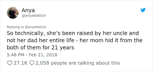 «То есть фактически эта девушка в течение всей жизни воспитывалась не собственным отцом, а своим дядей. А ее мать скрывала это от них обоих 21 год».