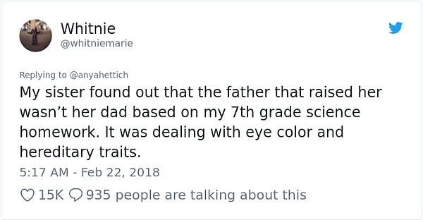 «Моя сестра, выполнявшая домашнее задание о цветах глаз и наследственных чертах, еще в 7-ом классе поняла, что отец, который воспитывал эту девочку, не был настоящим».