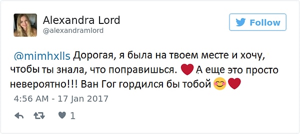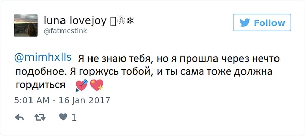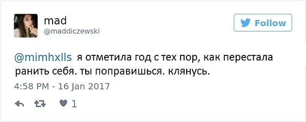 «Я помню, как, закончив рисунок наполовину, захотела смыть все и пойти спать. Но я так рада, что закончила работу, потому что теперь у меня есть, что рассказать о плохом дне, вместо того чтобы просто показать отметины от порезов. Как бы плохо ни было, это не стоит того, чтобы совершать над собой физическое насилие».