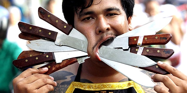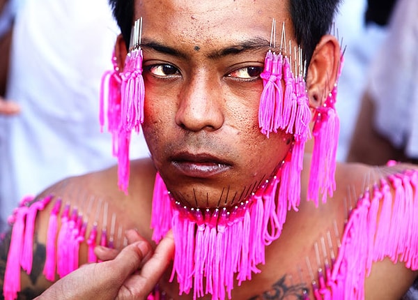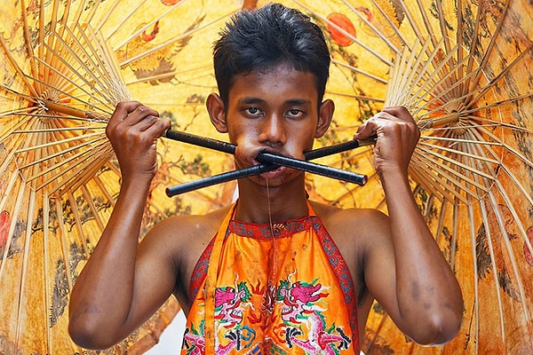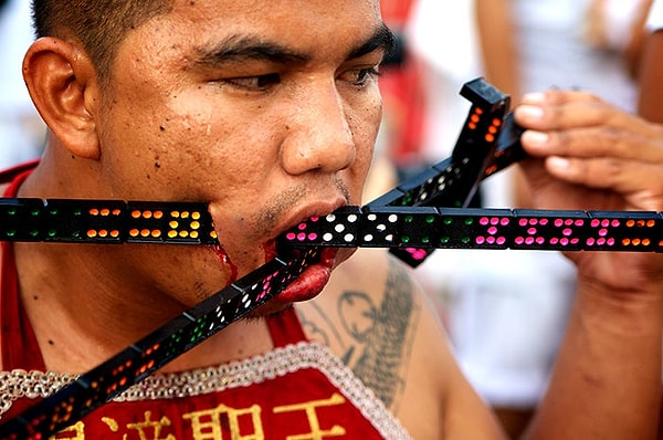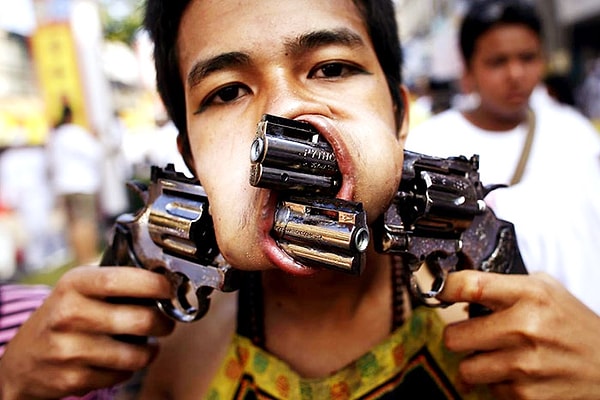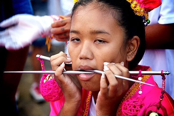 Большинство участвующих в этом фестивале подвергают себя самым изощренным пыткам, прокалывая себе кожу и засовывая туда разные предметы. Считается, что таким образом они доказывают свою веру в богов и преданность им. Ведь боги могут защитить от всего: от шрамов, смерти и ранений. И тайцы продолжают практиковать засовывать в дырки в коже ножи, сабли, зонтики, электродрели и прочие вещи.