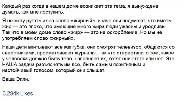 Она позвала их к себе в комнату и начала разговор. 'Правда в том, что я не жирная, — сказала Эллисон. НИКТО не жирный. Никто на свете не может БЫТЬ жирным. Но у людей может быть жир. Жир защищает наши мускулы и кости и дает нам энергию'. Она продолжила говорить о том, что 'жир' — это не оскорбление, а обычное слово.