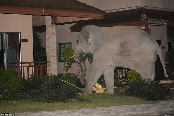 Местный смотритель парка Амнат Норасин сказал: «Слон живет в лесу, но часто ходит ночью по домам в поисках еды. Люди знают его.»