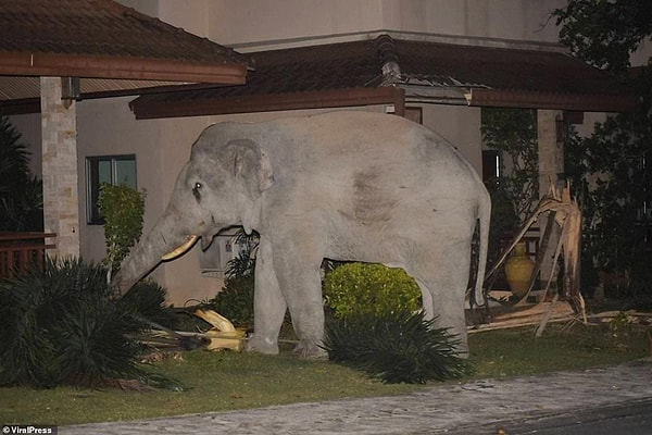 Домашний котенок прогнал четырехтонного слона, который забрел в его сад в поисках еды в Таиланде