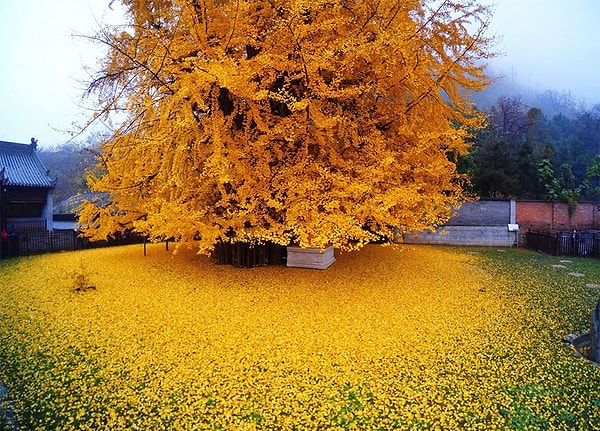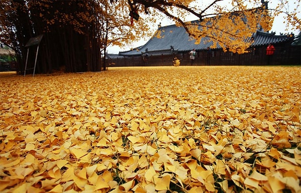 Древнее китайское дерево превращает землю буддийского храма в желтый океан