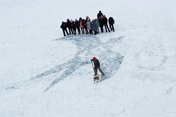 Его картины уникальны и, к сожалению, недолговечны: он создает их на снегу с помощью метлы или лопаты.