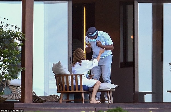 Он опустился на колени до уровня Дженнифер, чтобы пообщаться со своей возлюбленной, пока она оставалась на шезлонге.