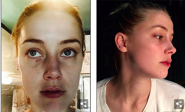 В рамках дела о клевете против Херд на 50 миллионов долларов, Депп включил изображения своего собственного избитого лица (слева и справа) после предполагаемых нападений Херд.