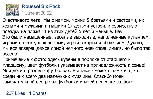 «Это была идея моей сестры, - говорит Крисси, мама 6 детей в розовых футболках. – Большая семья – это всегда много шума, смеха и, что более важно, любви. Среди 17 кузенов обязательно найдутся те, с кем будет весело играть и общаться. Они развлекаются вместе. Мне нравилось расти в большой семье, и я счастлива, что мои дети могут получить тот же опыт».