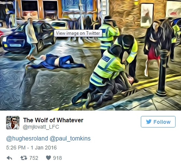 Это фото, снятое фотографом Джоэлом Гудманом, было опубликовано на сайте Manchester Evening News, в колонке, где рассказывали, как жители Манчестера отметили Новый год. Заголовок под снимком гласил: «Полицейские задерживают мужчину, пока другой лежит на проезжей части».