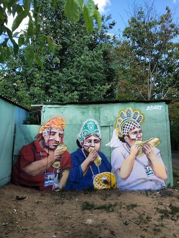 1. Троица жующих в кокошниках оказалась все-таки россиянами. А испанские флаги на щеках вместе с российскими (российские флаги на фото просто не видно) им нарисовали волонтеры.
