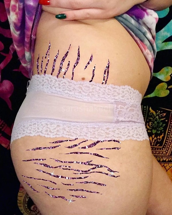 В своем проекте пакистанская художница Сара Шакил взяла за основу это искусство и решила превратить растяжки женщин в нечто прекрасное, в то, чем можно и нужно гордиться. Шакил просит своих подписчиков присылать ей фото с растяжками и «покрывает» их блестками.