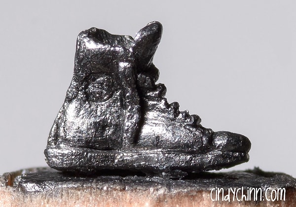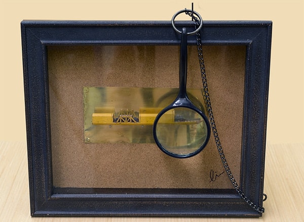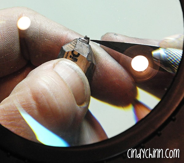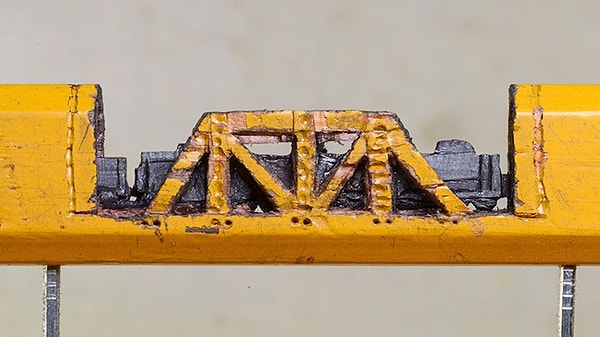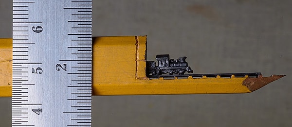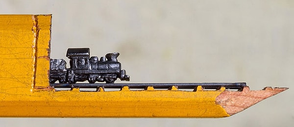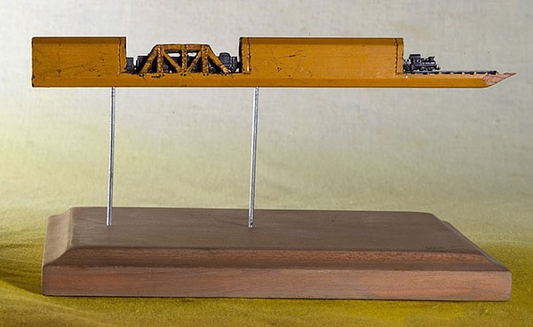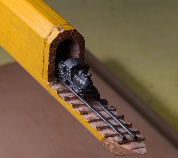 Используя увеличительное стекло и нож фирмы X-Acto, художница Синди Чинн высекла крошечный поезд и его продолжение в карандаше. Эта миниатюра, показывающая, как поезд выныривает из тоннеля, всего 2 см в высоту и около 13 см в длину. Карандаш является важной частью миниатюры и служит ландшафтом для детальной работы Синди.