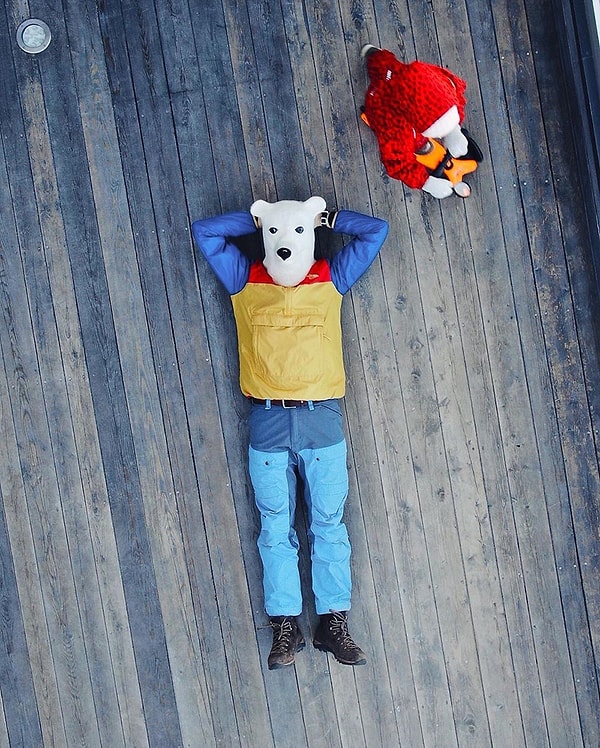 Теперь Эйнар, как и все мы, находится на самоизоляции. И все же он должен продолжить выполнять свою страсть к путешествиям в пределах своего дома. Он борется со скукой, воссоздавая приключения своего белого медведя с тем, что у него есть.