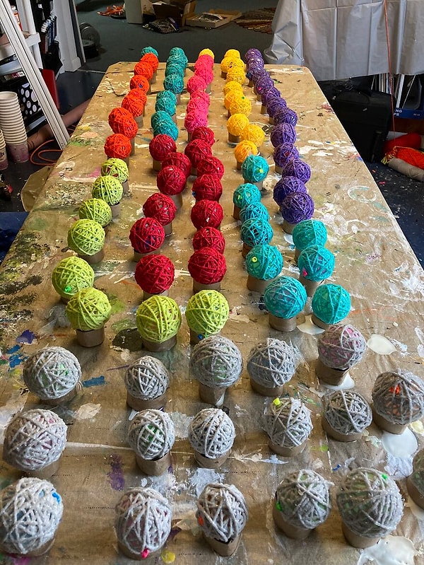 "Для украшения мы взяли 100 воздушных шаров и обмотали пряжей разного цвета."
