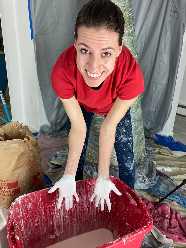 После создания гигантской конической формы им удалось пропитать пряжу однокомпонентным клеем, однокомпонентной смесью кукурузного крахмала и покрыть всем этим весь конус. Понадобилась неделя, чтобы высох клей, и можно было изъять созданную форму и начать украшать ее.