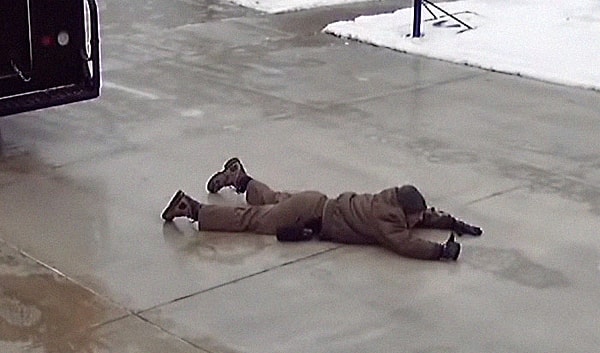 Так, один сотрудник службы доставки UPS был снят на камеру наблюдения, во время своей попытки доставить посылку по ледяной дороге.