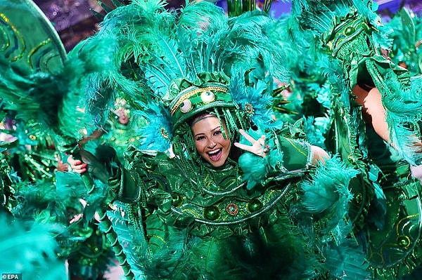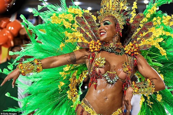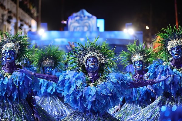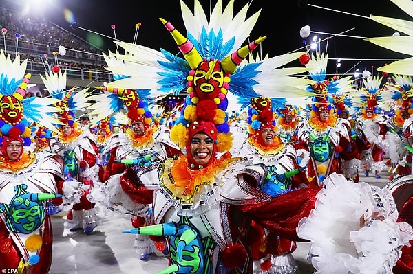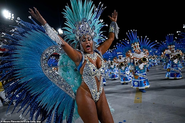 На двухдневном соревновании 12 лучших школ самбы города сражаются за звание чемпионов парада с ослепительными выступлениями, оглушительной музыкой и тысячами певцов, барабанщиков и танцоров в откровенных костюмах, инкрустированных драгоценными камнями и украшенных перьями.