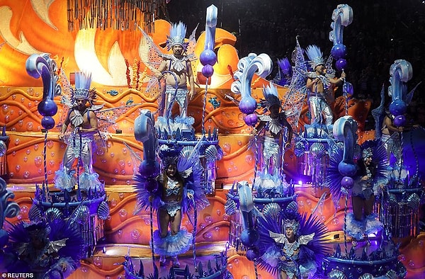 На фото: Участники из школы самбы Унидос да Тижука выступают на своем поплавке в подводной тематике.