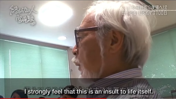 В видео, повторно опубликованном пользователем Twitter Tofu Pixel, легендарный аниматор Хаяо Миядзаки демонстрируют анимацию ИИ за работой. В презентации утверждается, что анимация, созданная искусственным интеллектом, принесёт идеи, о которых человеческий разум не может даже подумать. Раздосадованный таким смелым заявлением, Миядзаки ясно даёт понять, что он не только никогда не будет использовать эту технологию в своей работе, но и сама эта технология оскорбляет саму жизнь.
