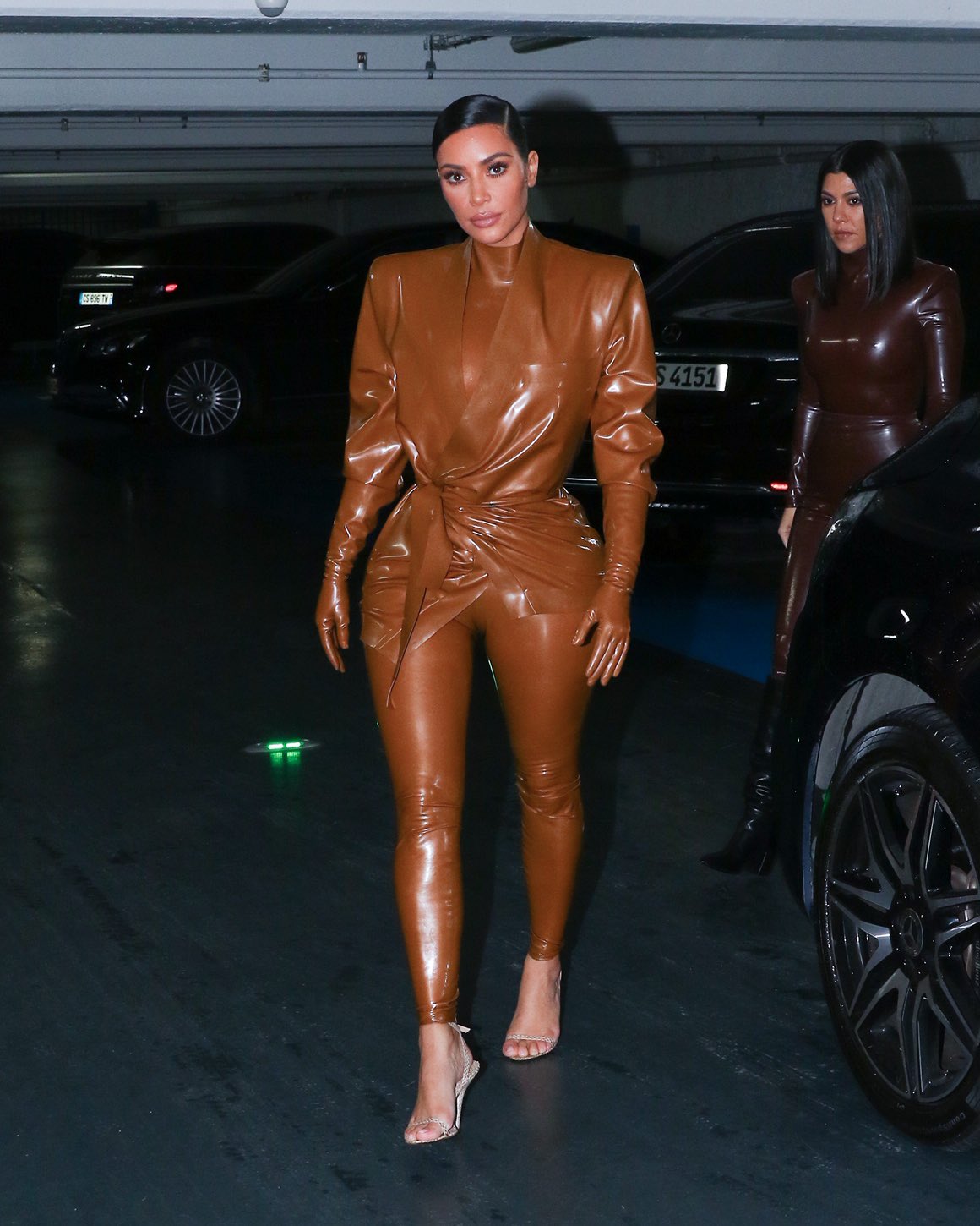 В костюме из латекса от Balmain сестры посетили воскресную службу Канье Уэста в Париже.